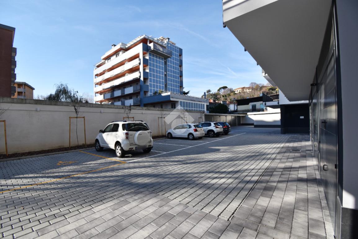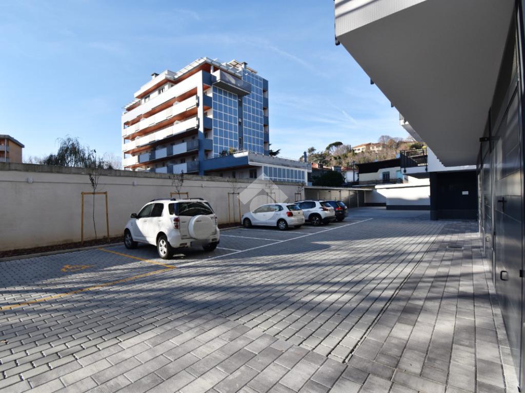 Comodo parcheggio condominiale delimitato da sbarra automatica.